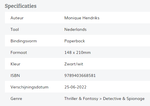 Monique Hendriks heeft wat mij betreft een goede zet gemaakt om haar boek in eigen beheer uit te geven. Persoonlijk denk ik dat de uitgeverij spijt krijgt. Het is een goed debuut met een goede opbouw in de spanning, goede personages waarbij verschillende emoties spelen. Kortom: een enorm goed debuut van een schrijfster die lef heeft en ik denk dat we nog meer van haar gaan horen.